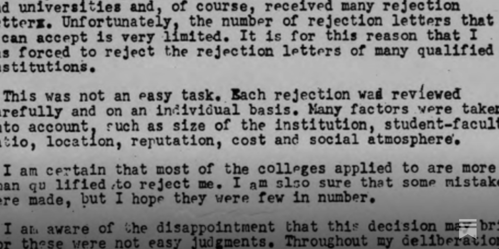 Many students receive rejection letters every year. I have to admit it was tough choosing a rejection letter to not accept. Photograph depicts an admissions rejection letter sent by Harvard College.